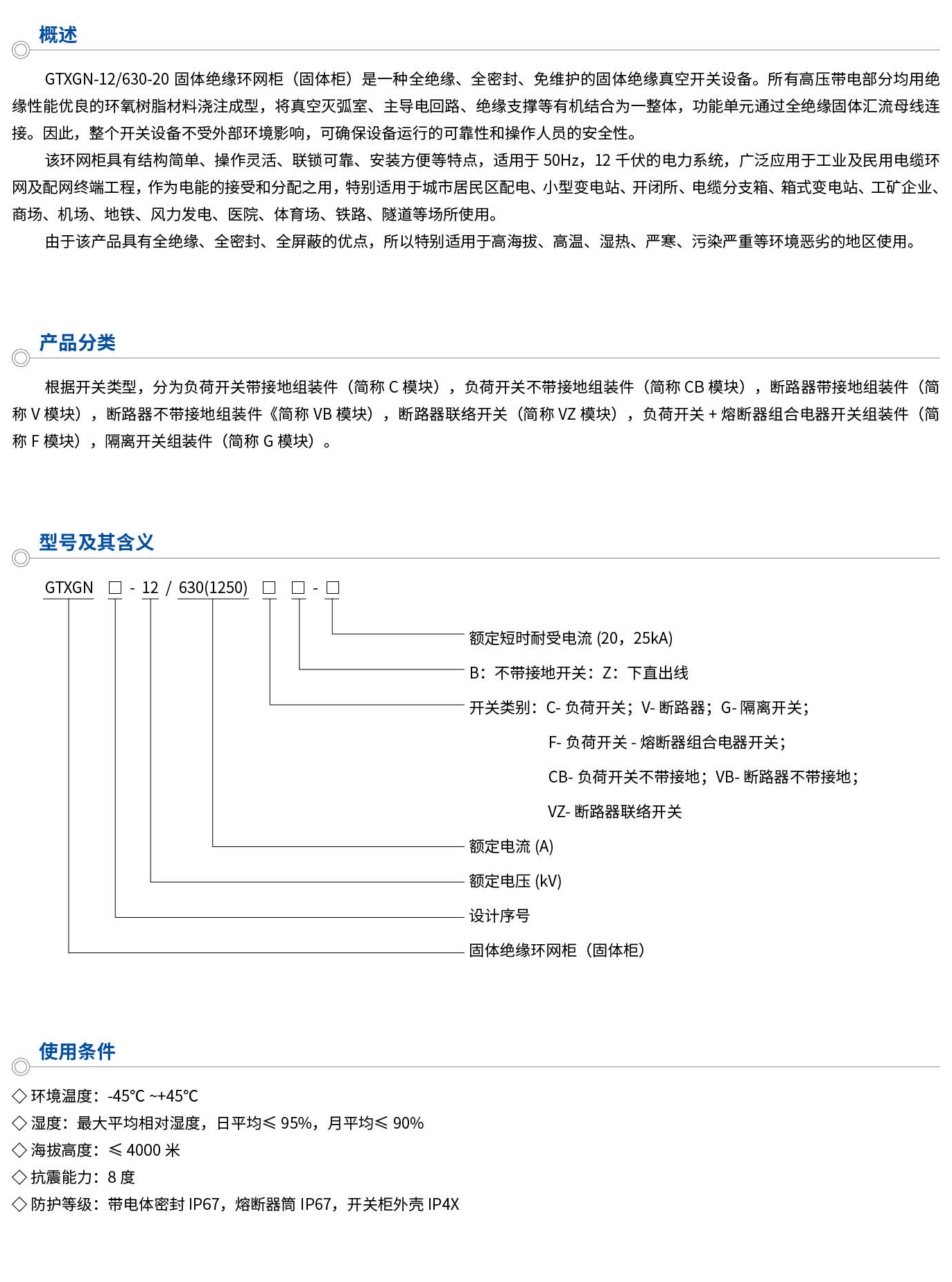 GTXGN-12/630-20固體絕緣環(huán)網(wǎng)柜(固體柜)是一種全絕緣、全密封、免維護(hù)的固體絕緣真空開關(guān)設(shè)備。所有高壓帶電部分均用絕緣性能優(yōu)良的環(huán)氧樹脂材料澆注成型,將真空滅弧室、主導(dǎo)電回路、絕緣支撐等有機(jī)結(jié)合為一整體,功能單元通過全絕緣固體匯流母線連接。因此,整個開關(guān)設(shè)備不受外部環(huán)境影響,可確保設(shè)備運行的可靠性和操作人員的安全性。該環(huán)網(wǎng)柜具有結(jié)構(gòu)簡單、操作靈話、聯(lián)鎖可靠、安裝方便等特點,適用于50Hz,12千伏的電力系統(tǒng),廣泛應(yīng)用于工業(yè)及民用電纜環(huán)網(wǎng)及配網(wǎng)終端工程,作為電能的接受和分配之用,特別適用于城市居民區(qū)配電、小型變電站、開閉所、電纜分支箱、箱式變電站、工礦企業(yè)、商場、機(jī)場、地鐵、風(fēng)力發(fā)電、醫(yī)院、體育場、鐵路、隧道等場所使用。由于該產(chǎn)品具有全絕緣、全密封、全屏蔽的優(yōu)點,所以特別適用···