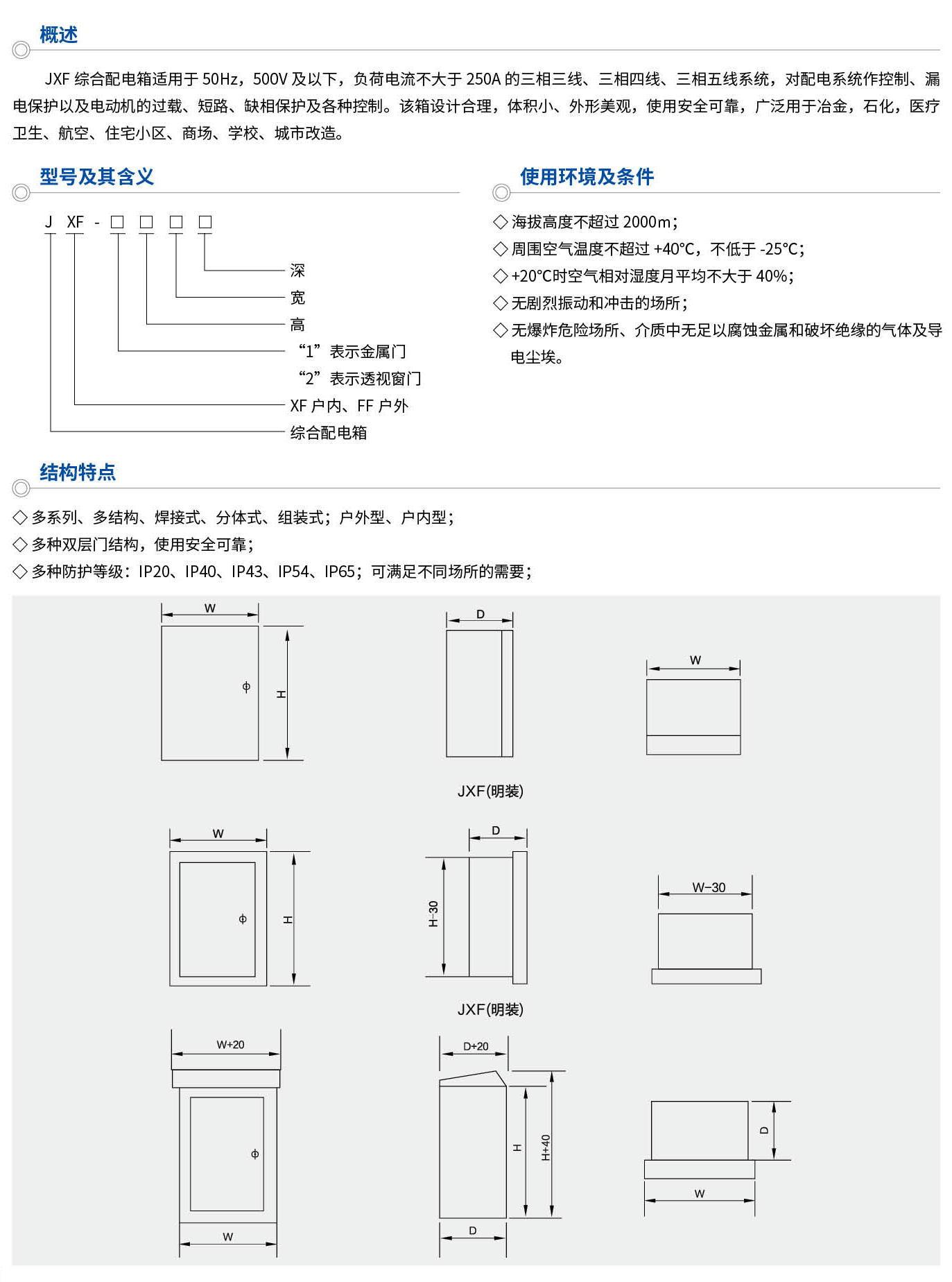 JXF綜合配電箱適用于50Hz,500V及以下,負(fù)荷電流不大于250A的三相三線、三相四線、三相五線系統(tǒng),對(duì)配電系統(tǒng)作控制、漏電保護(hù)以及電動(dòng)機(jī)的過載、短路、缺相保護(hù)及各種控制。該箱設(shè)計(jì)合理,體積小、外形美觀,使用安全可靠,廣泛用于治金,石化,醫(yī)療衛(wèi)生、航空、住宅小區(qū)、商場(chǎng)、學(xué)校、城市改造。