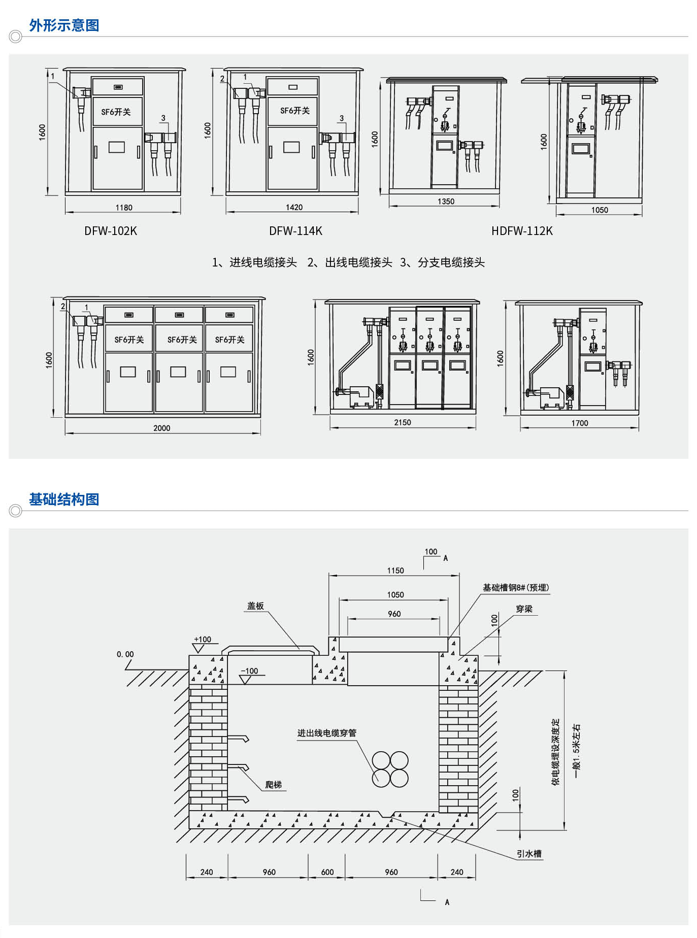 功能特點:采用預制式帶電可觸摸硅橡膠電纜頭,全密封、全絕緣、免維護,可靠保證人身安全。結構緊湊,外形小巧美觀,不銹鋼雙層稻體,使用壽命可達二十年以上;在不影響主網運行的前提下,實現區域停電檢修,減小停電范圍;可配一臺或多臺SF6負荷開關。接線方式靈活多樣,分支出線可達8回路;可選避雷器、短路故障指示器、限流熔斷器等,滿足用戶各種要求。